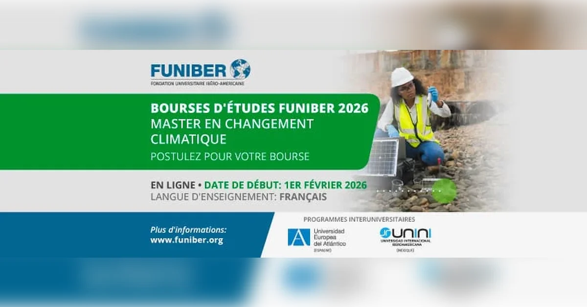 La Bourse Master Changement Climatique 2026 est une aide financière partielle proposée par FUNIBER pour un master universitaire 100 % en ligne, débutant le 1er février 2026, d’une durée de 12 à 24 mois, délivré par une université partenaire reconnue.