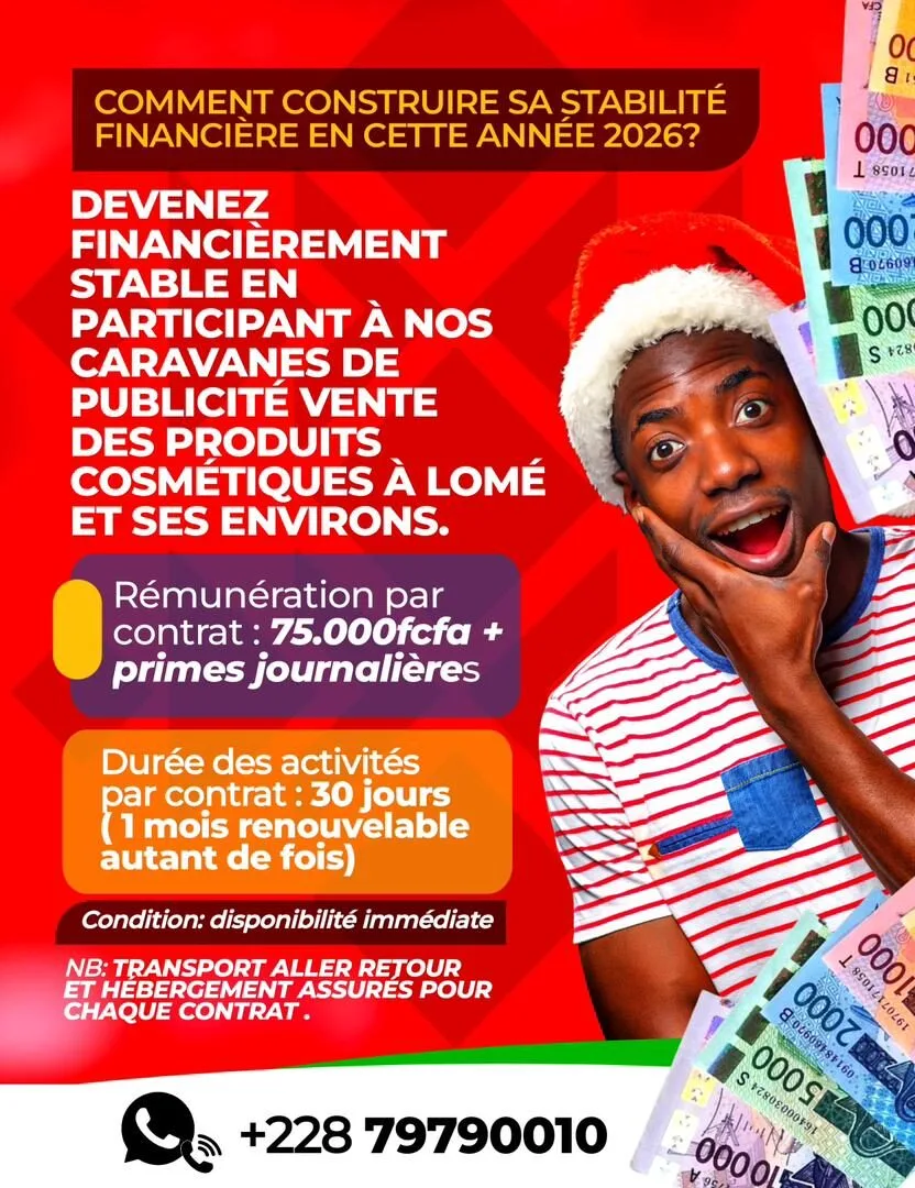 Rémunération : 75000fcfa + des primes journalières par contrat