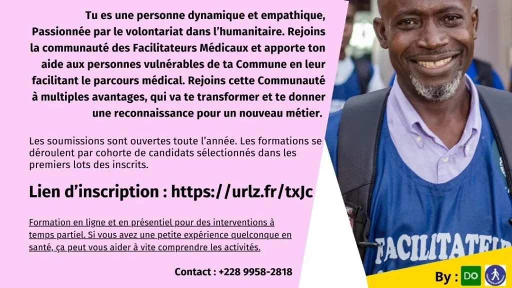 Vue(s): 741 Célébrons nos Héros : Les Facilitateurs Médicaux ! Chaque année, des milliers de patients vulnérables notamment les personnes âgées, les femmes enceintes, les patients handicapés, les enfants, les patients en état d’urgence, bénéficient de l’énergie des volontaires Facilitateurs Médicaux dévoués à la cause d’une meilleure accessibilité aux soins de santé dans les hôpitaux. Le travail des facilitateurs médicaux est essentiel pour soutenir les communautés en difficulté, répondre aux urgences et apporter de l’espoir dans les moments les plus sombres de la maladie. Postulez pour devenir un Facilitateur Médical ou une Facilitatrice Médicale Lien d’inscription : https://urlz.fr/txJc