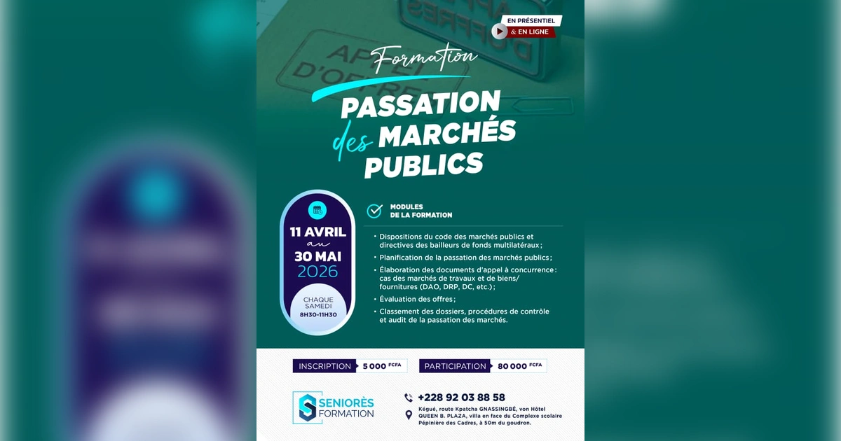 Le Centre de formation Professionnelle SENIORÈS-FORMATION, Arrêté N°2024/019/ MEPST/MET/CAB/SE-CCCS organise du 11 avril au 30 mai 2026 sa sixième session de formation théorique et pratique en Passation des Marchés.