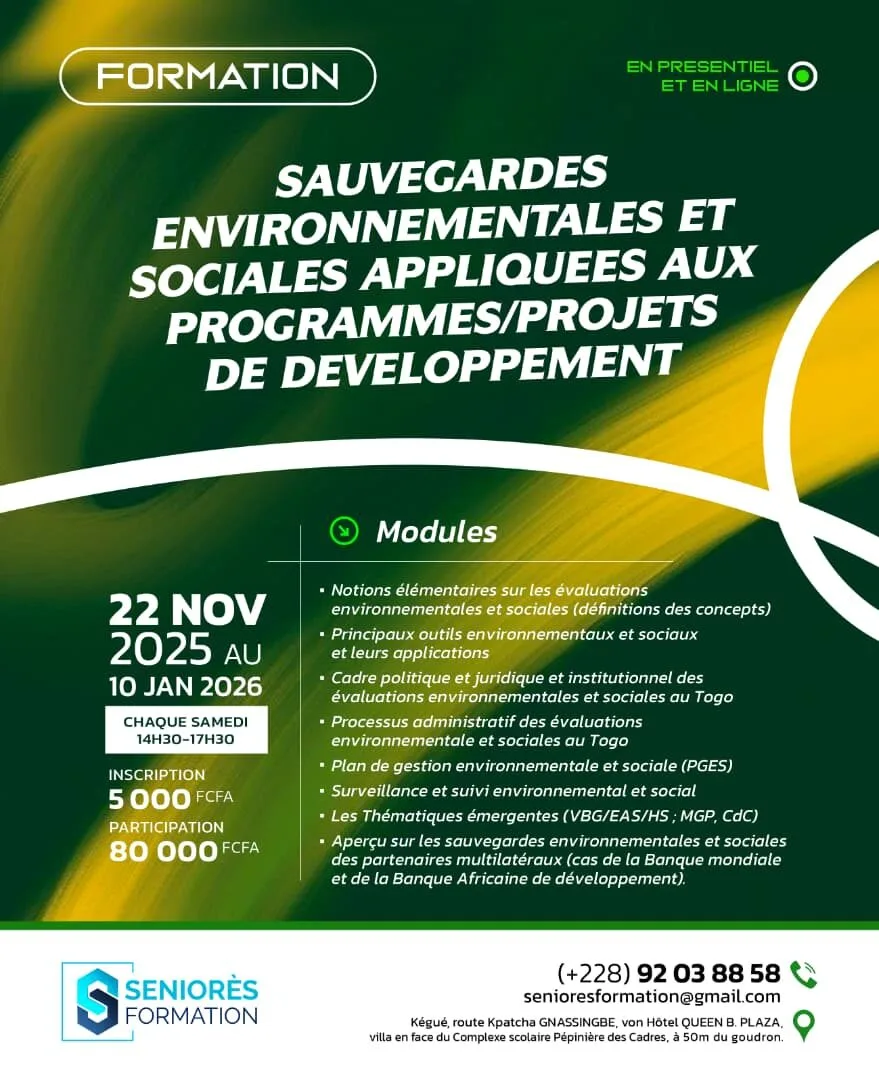 Le Centre de formation Professionnelle SENIORES-FORMATION, Arrêté N° 2024/019/ MEPST/MET/CAB/SE-CCCS organise du 22 novembre 2025 au 10 janvier 2026 sa huitième session de formation sur les sauvegardes environnementales et sociales appliquées aux programmes/projets de développement.