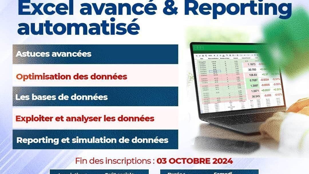 Vue(s): 471 © FORMATION EXCEL AVANCE & REPORTING AUTOMATISE L’institut de formation professionnelle FISCOGEF en abrégé IFOPP-FISCOGEF (Centre Agréé) organise deux (02) mois de formation en EXCEL AVANCÉ & REPORTING AUTOMATISE DÉBUT : 05 octobre 2024 ____ Agrément par ARRÊTÉ N°2020/020/METFP/CAB/SG/SE-CPO ___ PROFIL DES APPRENANTS : Étudiants ambitieux et Professionnel de tout domaine (Comptable, Analyste financier, Auditeur, expert, consultant,Gestionnaire RH, DRH, employé de banque/microfinance, commerciaux, autres, …) PROFIL DU FORMATEUR : ▪Expert-Consultant en MS Excel ADVANCED / Directeur de Société. ▪Enseignant vacataire près les universités, cabinets et instituts de renom. ▪Spécialiste en Analyse de la Performance et Modélisation de Tableaux de bord / VBA Excel. ▪Auteur du livre d’Excel avancé titré «la Clé d’Excel» Objectif Pédagogique : ▪Faire une tache de plus de 03 semaines dans moins de 03 minutes. ▪Gérer facilement une grande quantité de données et exploiter le plein potentiel d’Excel pour automatiser et fiabiliser les calculs ▪Réaliser des Reportings (Tableau de bord) et simulation de données. MODULE 1 : UTILISATION DES ASTUCES AVANCEES MODULE 2 : OPTIMISATION DE DONNÉES EXCEL Collaboration et Protection ; Audit de formule ; Validation des données (Restreindre l’accès de certaines données à une cellule, messages de saisie et d’erreurs) ; Commentaire ; … Lire la suite de Formation Excel avancé & reporting automatisé
