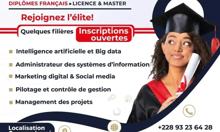 Vue(s): 331 Formations en Nouvelles Technologies au Togo : Marketing Digital, IA et Plus au Collège de Paris Supérieur Vous êtes passionné par les nouvelles technologies et souhaitez vous lancer dans une carrière prometteuse ? Le Collège de Paris Supérieur Togo vous offre des formations de qualité adaptées aux besoins du marché. Nos programmes : – Marketing digital – Banque finance et digital – Intelligence Artificielle – Et bien plus encore ! Pourquoi choisir le Collège de Paris Supérieur Togo ? – Enseignement par des professionnels expérimentés – Accompagnement personnalisé pour votre réussite – Possibilité de poursuivre votre cursus à l’étranger Les inscriptions se poursuivent ! Rejoignez Collège de Paris Supérieur dès aujourd’hui et construisez votre avenir dans le digital. Campus Lomé : Tokoin, dans l’enceinte du lycée scientifique. Face Hôtel Eda Oba ☎️ Contact : +228 93236428 / +228 96 19 56 04 africa@collegedeparis.fr #CollègeParisSupérieurTogo #InscriptionsOuvertes #Étudiants