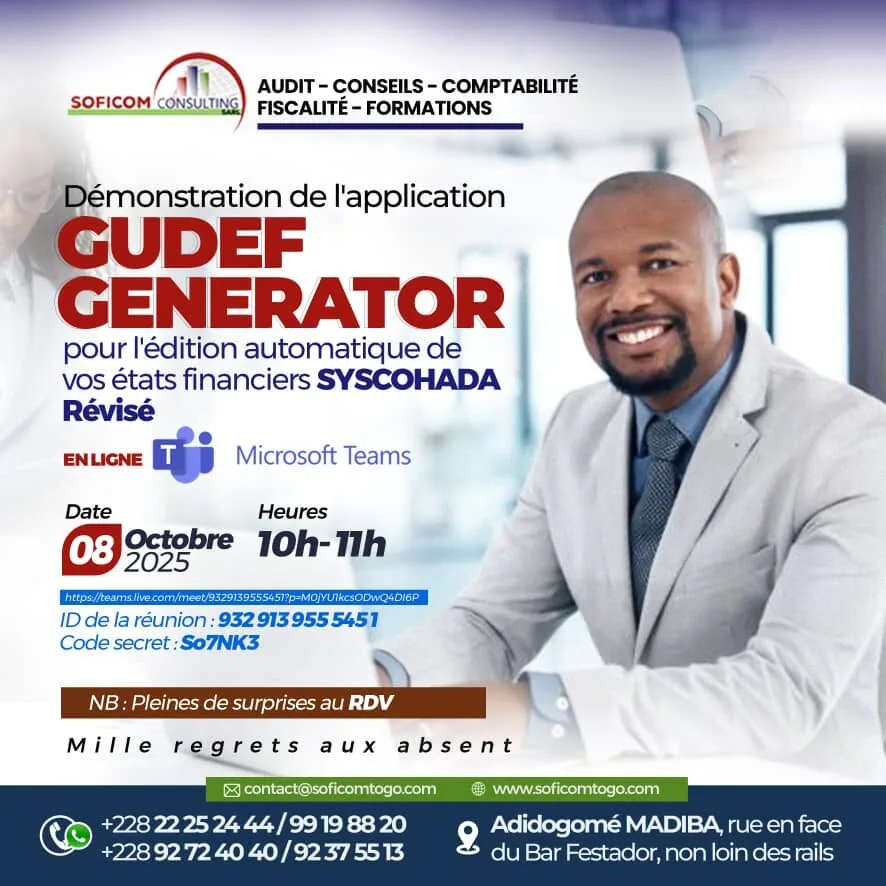 Alors Rendez-vous ce 08 octobre 2025 pour la démonstration de l’application « GUDEF GENERATOR » pour l’édition automatique de vos états financiers SYSCOHADA Révisé